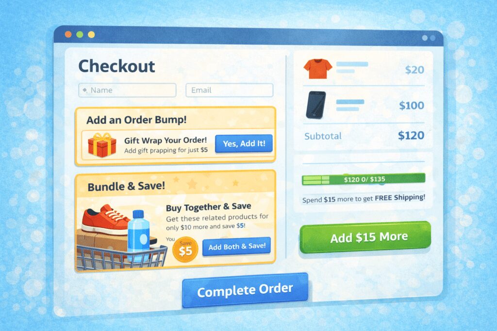 Order Bumps at Checkout: Small, low-cost add-ons can increase revenue instantly. Think of free shipping thresholds or a $5 gift wrap option.
