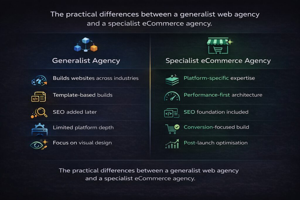 A specialist agency focuses on eCommerce platforms, inventory architecture, checkout optimisation, and SEO foundations as default parts of their process. A generalist builds across multiple sectors and applies a broader web development approach. In practice, the difference shows up in post-launch site speed, crawlability, and how well the store performs as a commercial asset.